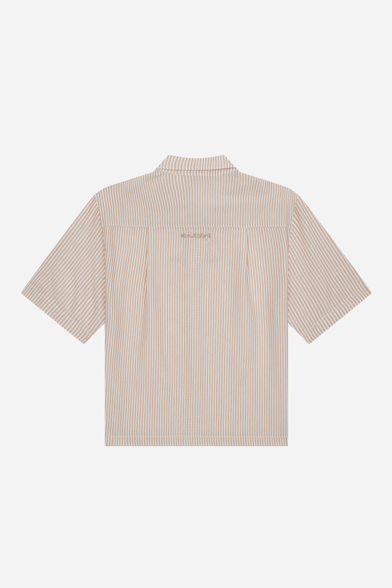 A lightweight summer shirt cut from striped seersucker cotton with tonal brand embroidery across the back. Features a square collar, French seams, and a relaxed fit through the body and sleeve.